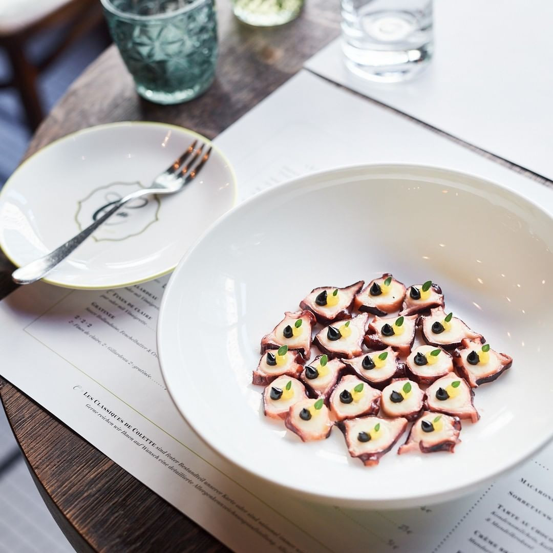In der Brasserie Colette interpretiert Tim Raue die Brasserie-Küche ganz neu und überrascht die Gäste mit französischen Klassikern, die seine unverwechselbare Handschrift und den besonderen Twist aus Süße, Schärfe und Säure klar erkennen lassen.